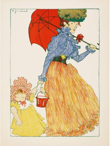 Den Haag, Mouton (1898). Omslag half perkament, ontwerp en 11 decoraties in lithografie door Edz. Koning op handgeschept papier.