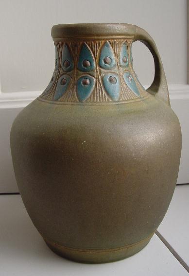 Aardewerk met jugendstil decoratie in geel en blauw op donker beige ondergrond ( ong. 1905)