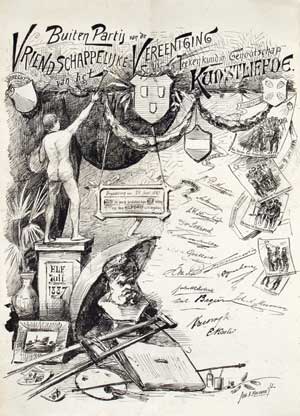 Lithografie. De Ver.voor de Ned.Tent. Van Huisindustrie (1906) stelde zich ten doel de aandacht te vestigen op de slechte omstandigheden in de huisindustrie.