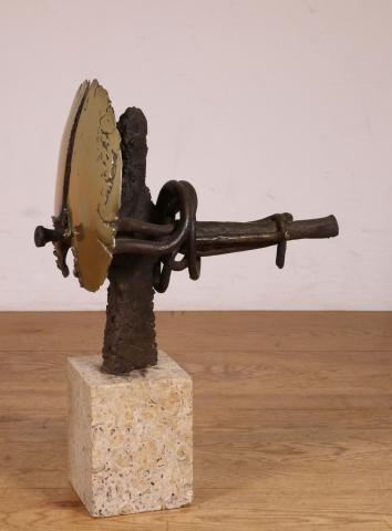 Bronzen sculptuur, gedeeltelijk gepolijst, op hardstenen sokkel