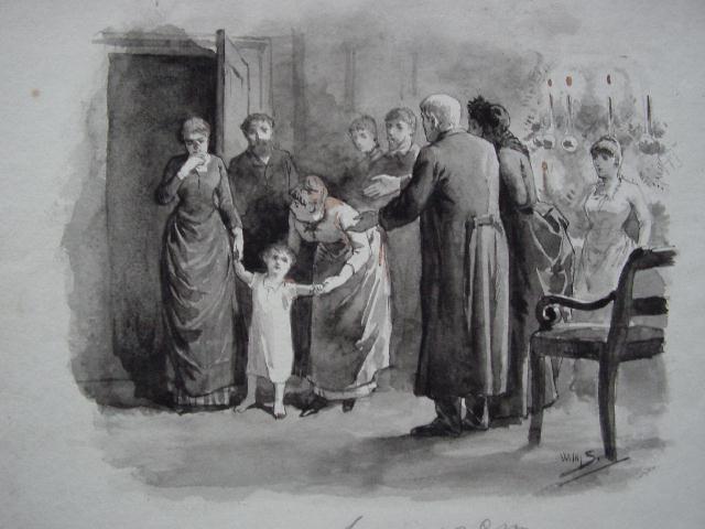 Gewassen pentekening/gesigneerd/illustratie (p.8) voor boek van Fiora della Neve \'Ook een kerstgeschenk\'.