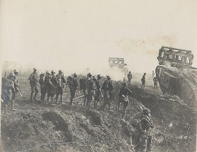 Attack on Hindenburg line, Tanks and troops going forward.