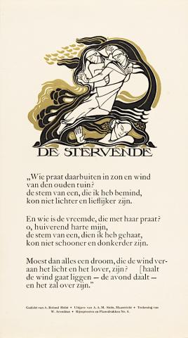 Rijmprent met gedicht door A. Roland Holst - De Stervende - Uitgave van A.A.M. Stols. - Maastricht, 1929. - Met illustratie in litho door W. Arondeus. - 38x21cm. - Serie: Rijmprenten en planodrukken No.4.