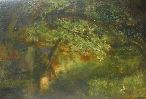 Tentoongesteld: \'Maris tentoonstelling 1935-36\', Gemeentemuseum Den Haag, 22 Dec. 1935 - 2 Febr. 1936, cat. no. 7, Herkomst: Generaal H.C. Nauta \'s-Gravenhage. Tentoonstellingscat. P. 26 no. 7: \'Twee jonge vrouwen baden zich in een vijver onder zwaar overhangend geboomte; waarschijnlijk geschilderd te Wolfhezen. In warme, groene en bruin toon, zeer dun geschilderd met fijne uitdrukking van de intieme sfeer.\'
