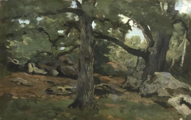 Op achterzijde etiket Van Wisselingh en titel \'Fontainebleau\'.
