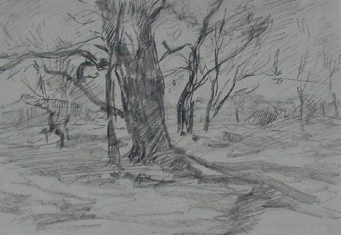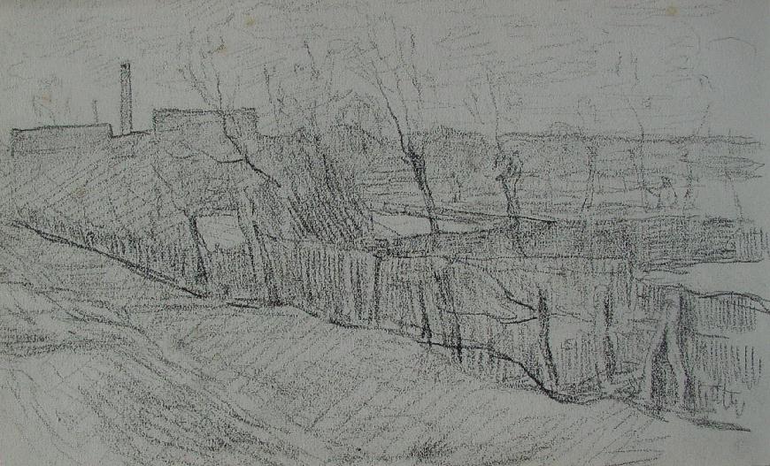 Potloodtekening op papier, gesigneerd met monogram en gedateerd '03 l.o.. Voorstelling van het bijbelverhaal van Jezus die in gezelschap van zijn drie discipelen Petrus, Jacobus en Johannes de berg Tabor opgaat, waar hij spreekt met de reeds lang overleden Mozes en Elia.