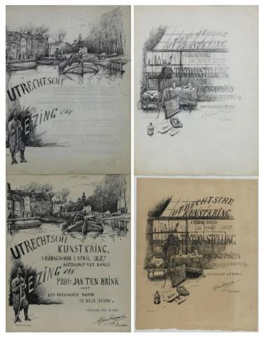 Twee originele voorstudies voor etsen van de 'Utrechtsche kunstkring', met de bijhorende etsen beide gesigneerd \'A van Rappard/1ste Secretaris\' (rechtsonder)