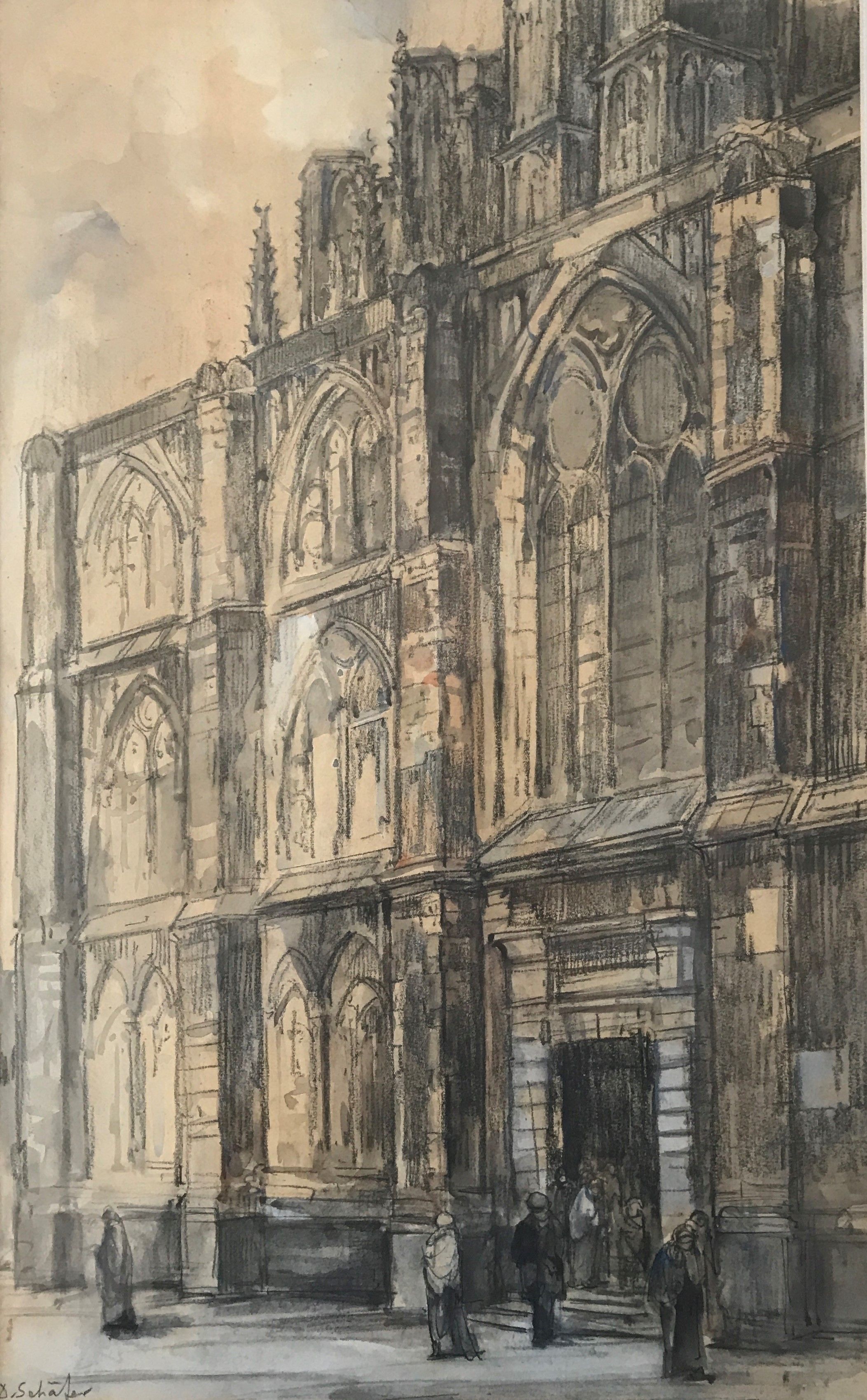 Gekleurd krijt op papier, gesigneerd.